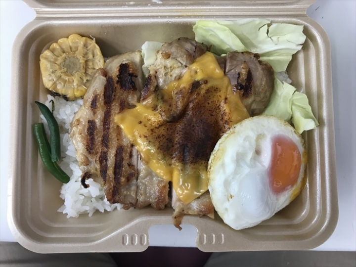 ごはんの上にガツンと肉が盛られており、そのまわりには目玉焼きとうもろこし等が入ってます。